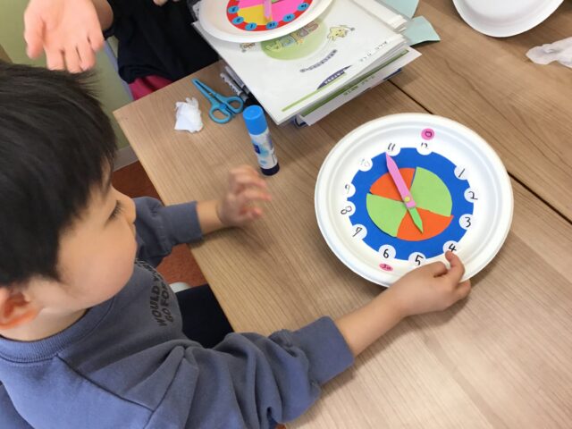 1月の幼児クラスでは、時計学習の導入として「時計工作」を行なっています。